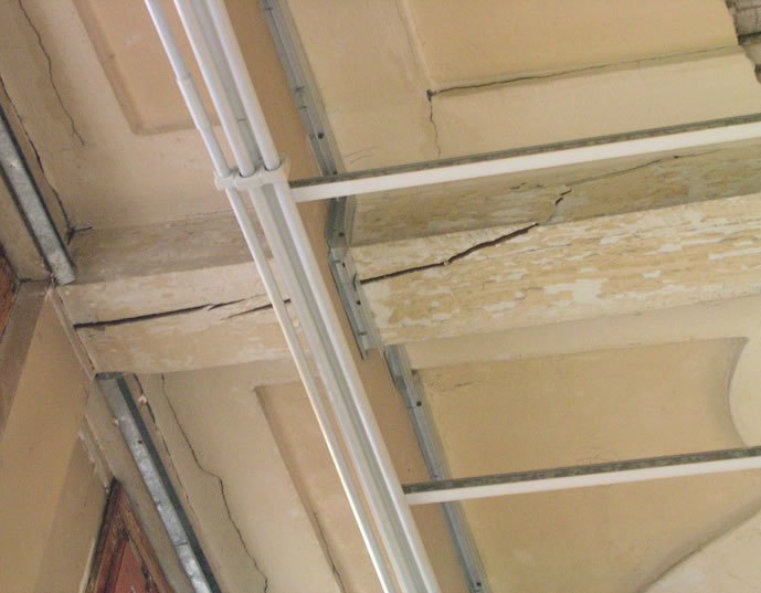 La struttura del sistema parete vetrata-solaio, risultata insufficiente, è stata sospesa alle capriate di copertura mediante tiranti metallici esterni.
