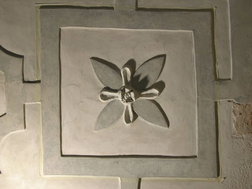 Particolare del soffitto a stucchi in fase di restauro